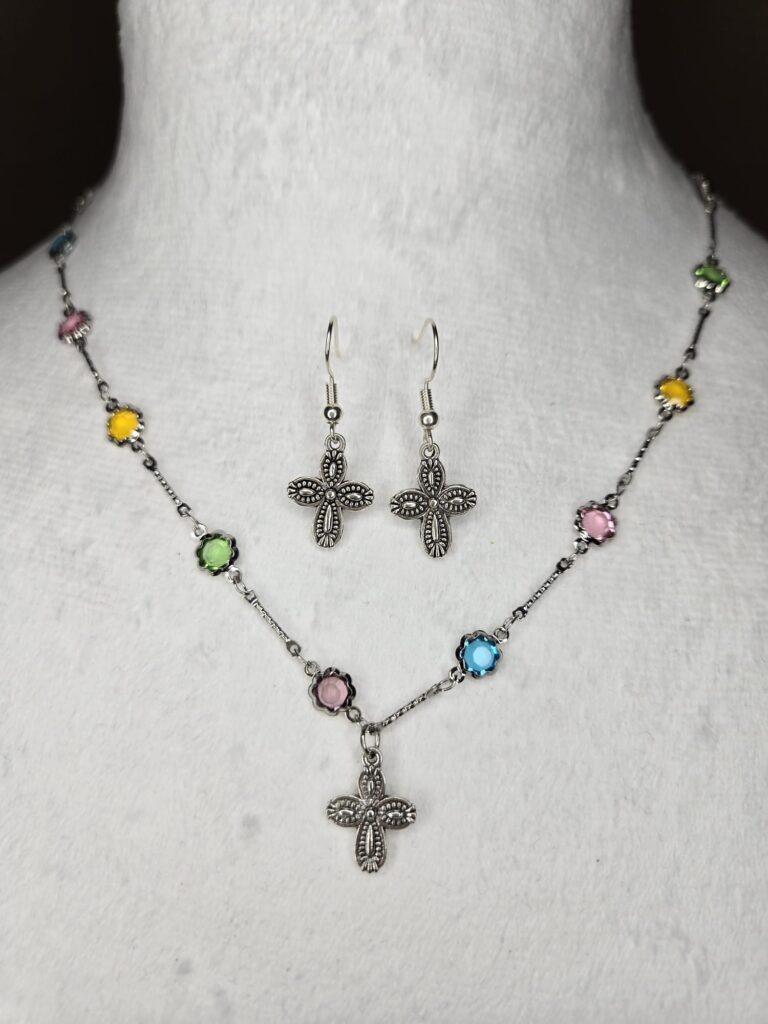Silver Multi-colored Chain w/ Vintage Cross Charm Set