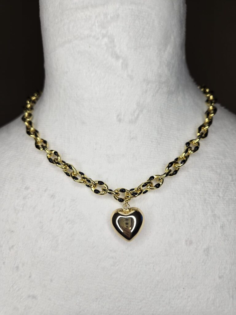 Gold & Black Chain-Link Necklace w/ Heart Charm