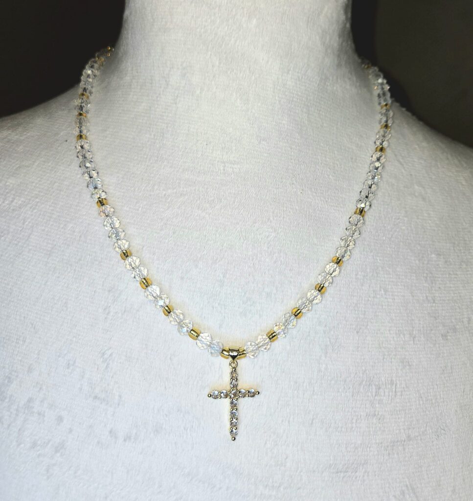 Glass Bead Necklace w/ White & Pink Cross Pendant
