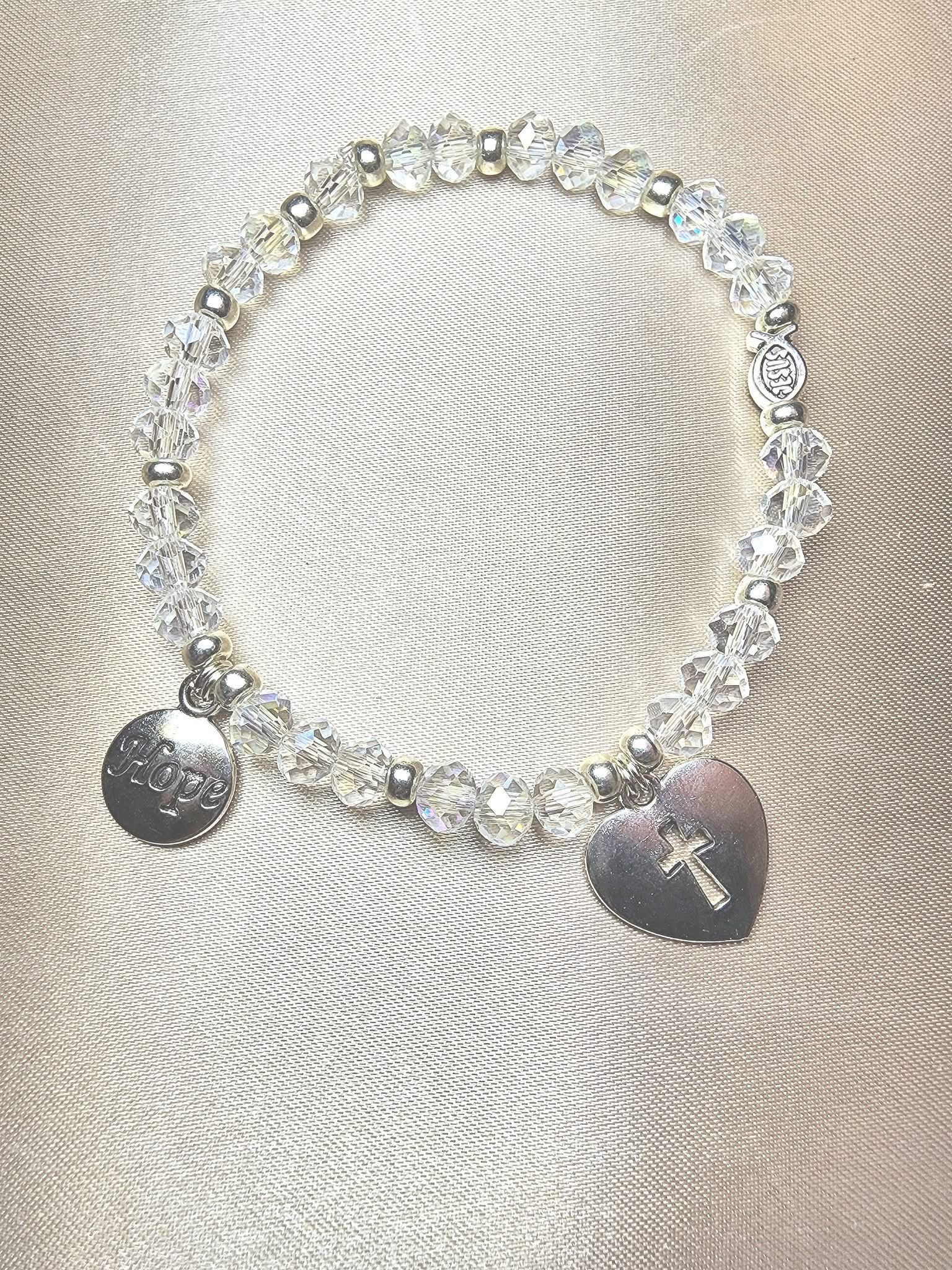 Glass bead bracelet with 2 full size silver charms and 1 silver bead charm. 7 inches long