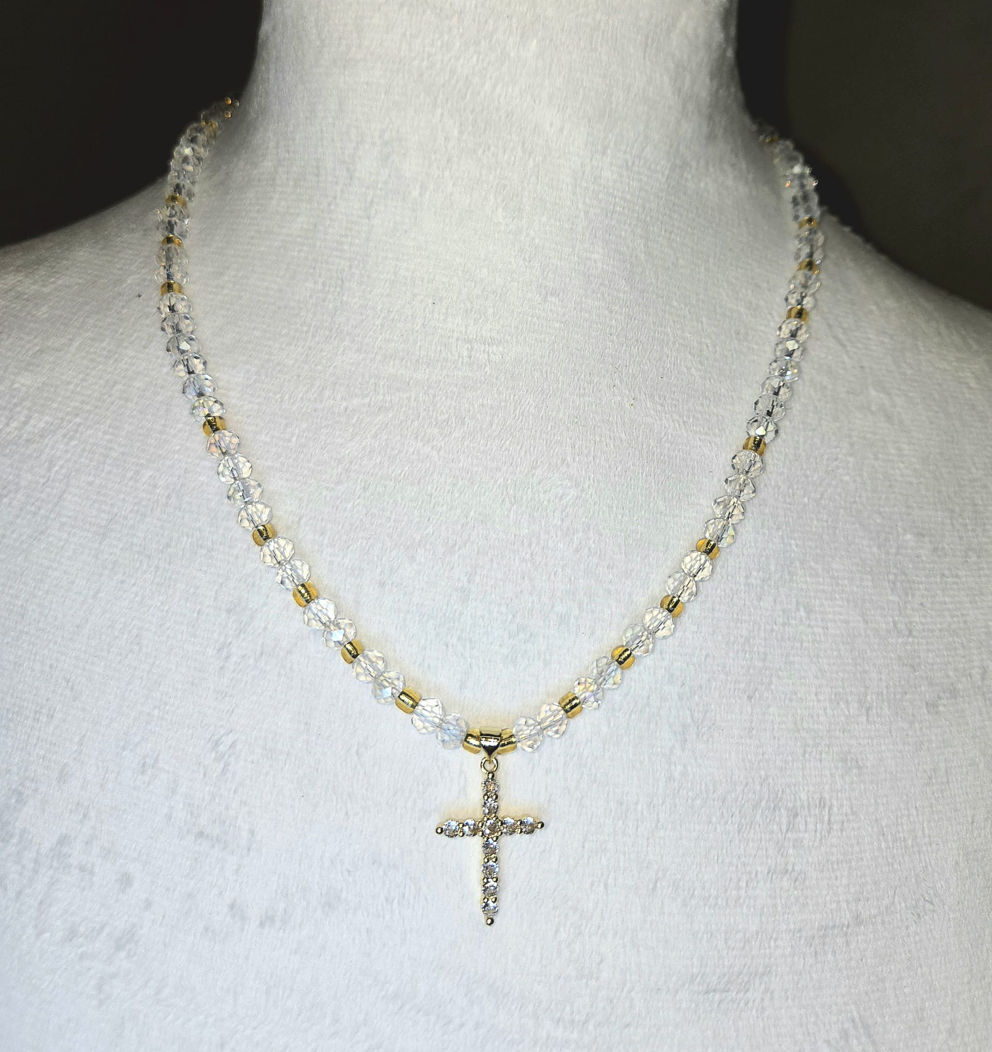Glass bead necklace with 18k gold-plated white cubic zirconia cross pendant. 20 inches long