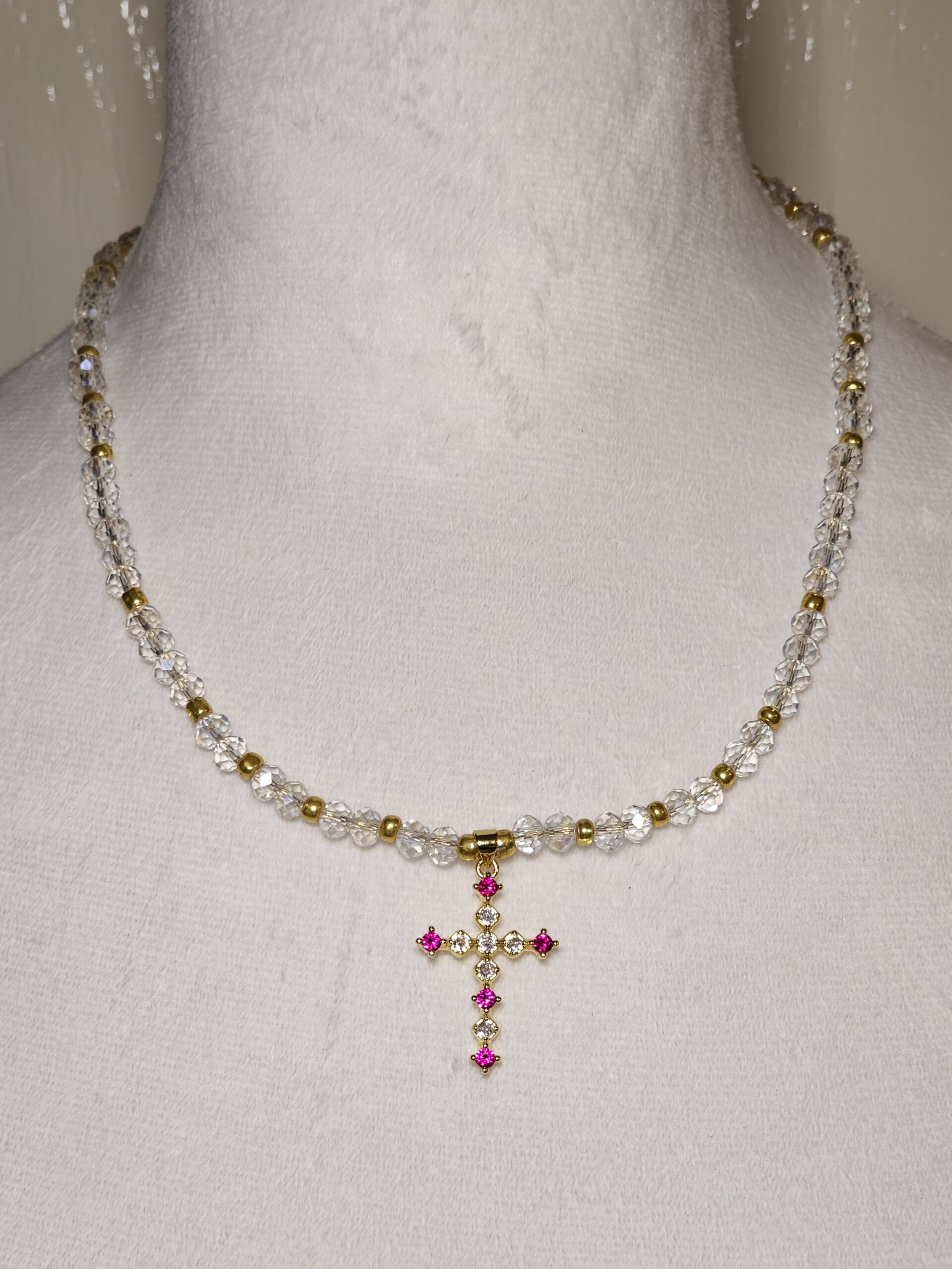 Glass bead necklace with 18k gold-plated white and pink zirconia cross pendant. 20 inches long