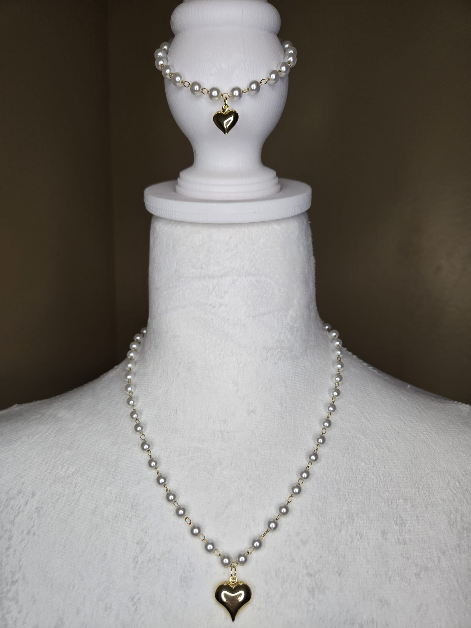 Pearl gold chain necklace and bracelet with 18k gold-plated heart charm.