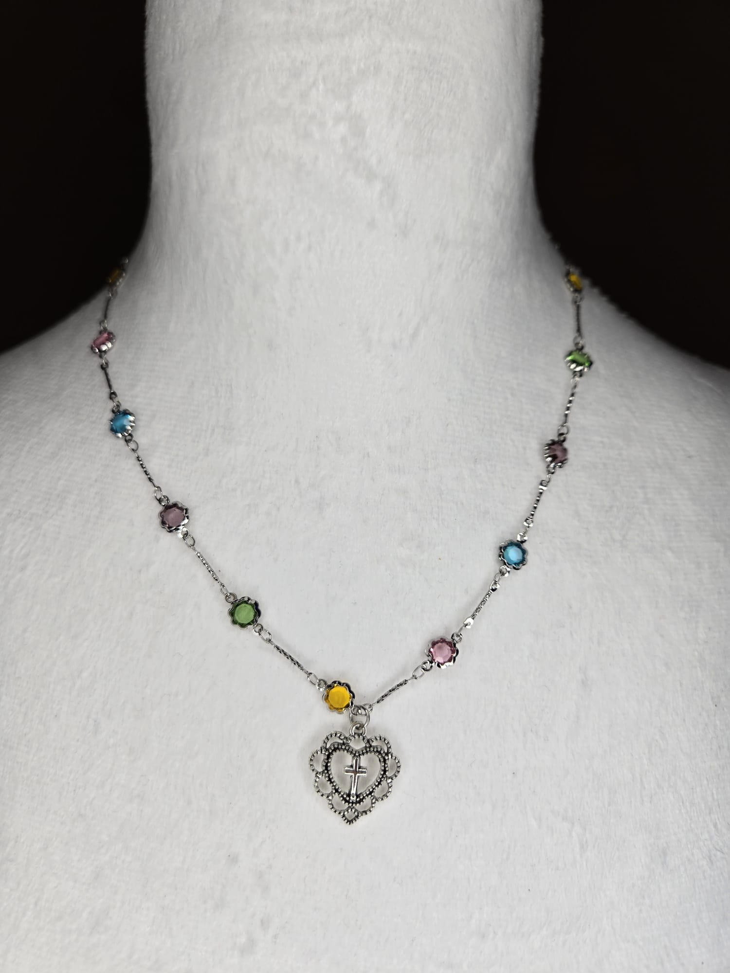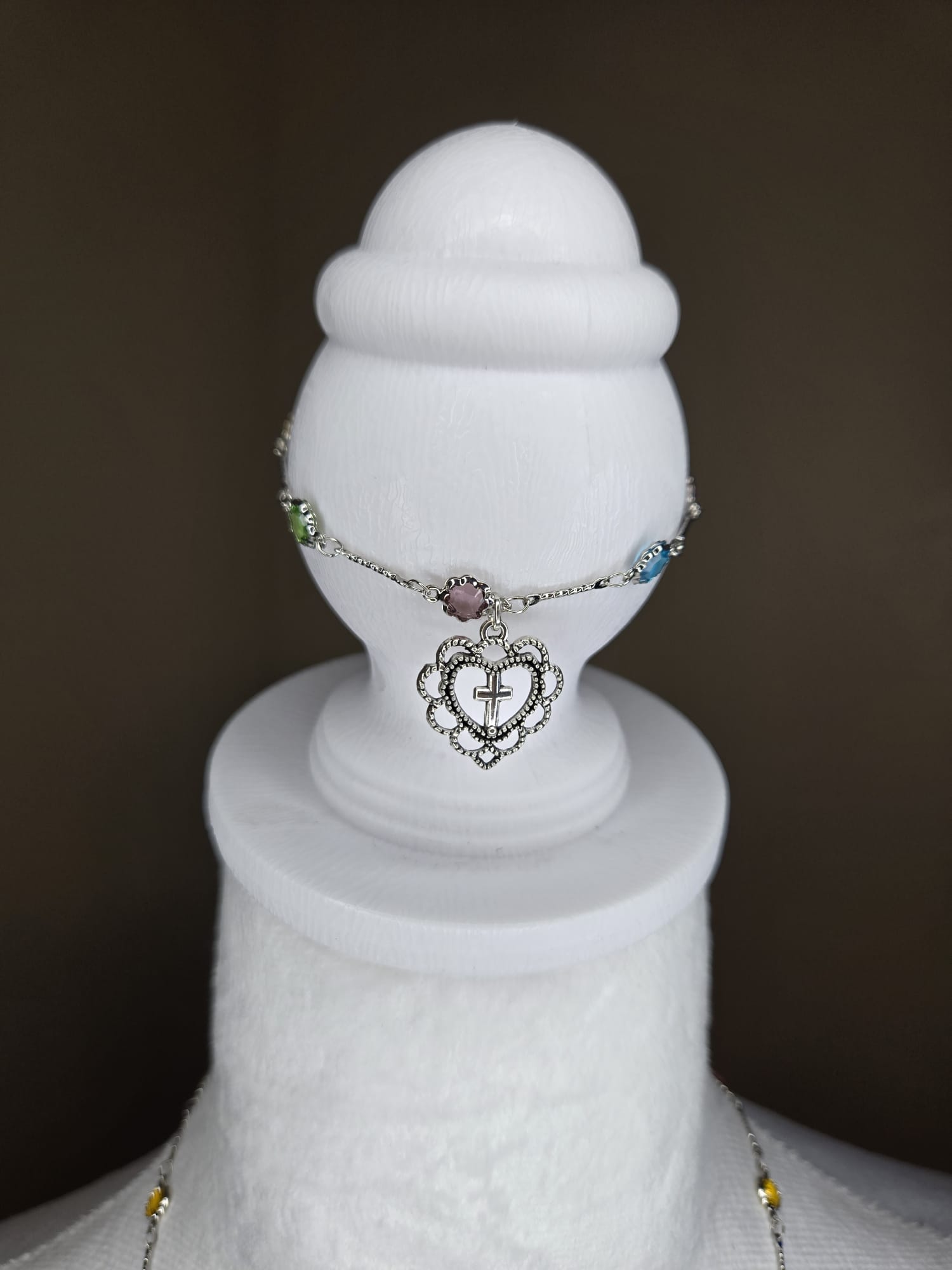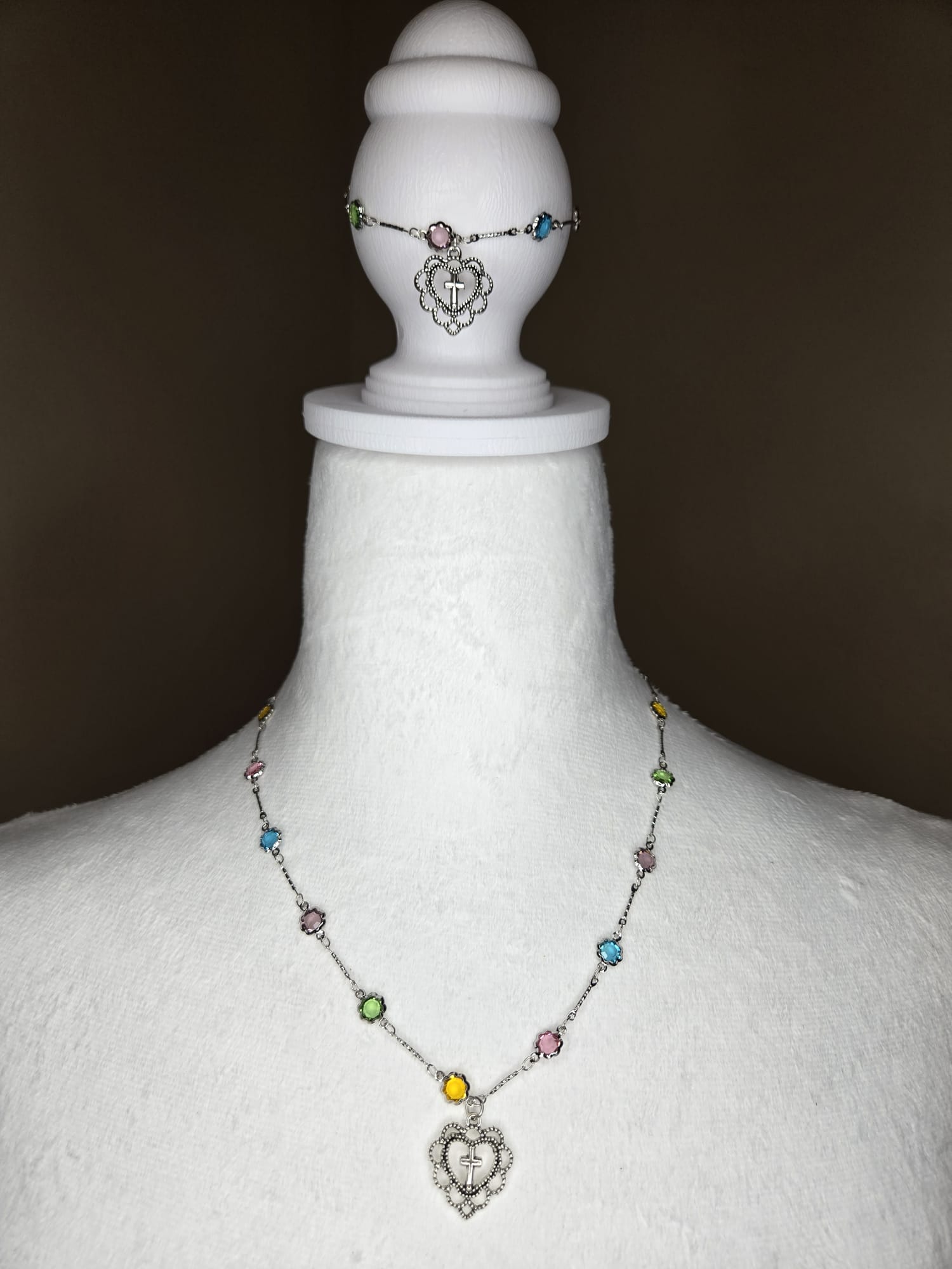 Silver multi-colored chain w/ cross heart charm necklace and bracelet set.