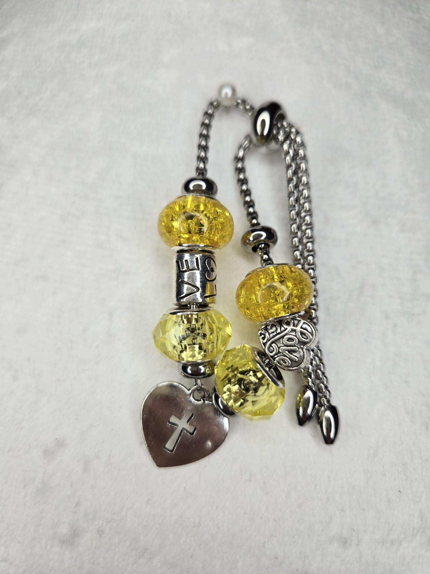 Silver stainless steel adjustable bracelet with 6 beads and a cross heart charm. These bracelets are one of a kind and sometimes cannot be replicated. Item might return with same color, but different style of bead.